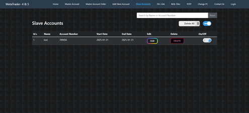 Add multiple Master and Slave accounts. Enable/disable them anytime using the on/off toggle in the dashboard.